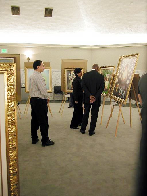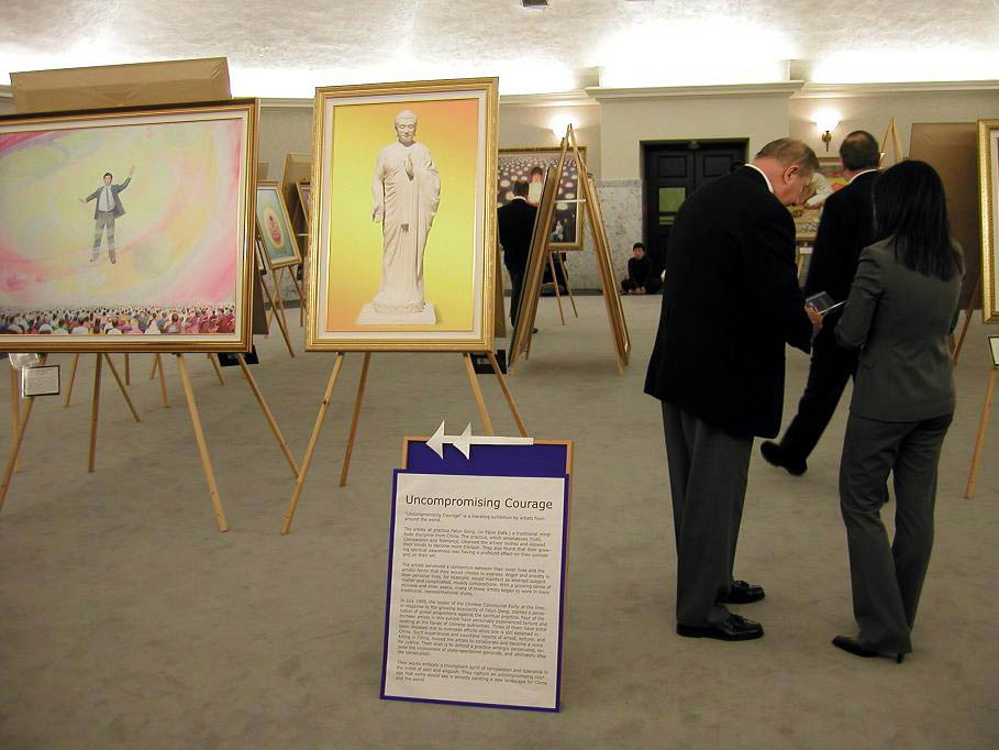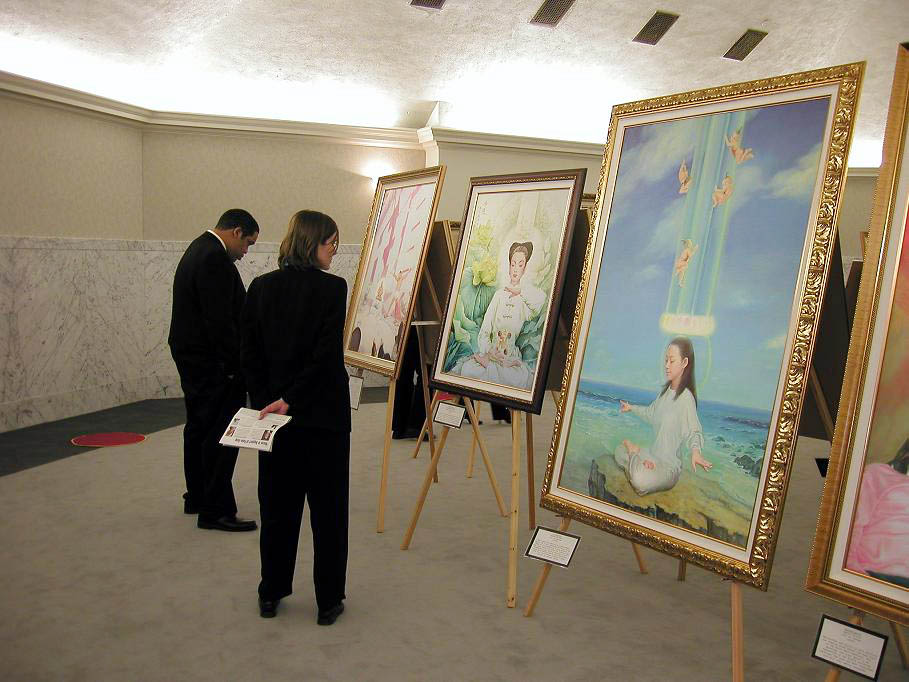 画展现场肃穆庄严,悠扬的音乐在六角形的大厅中回响。人们仔细观赏艺术作品的同时与学员交流、询问有关于大法和在中国发生的迫害的情况。一位安全工作人员看到“返本归真”的作品时被深深的触动。他说,“我向来相信人有他与神连接的一面,这幅作品让我找到了那种感觉,感受到纯净。”