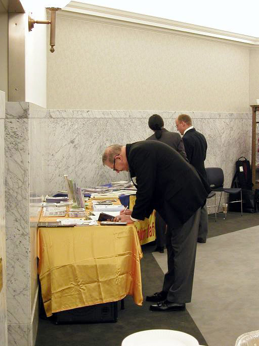 经过将近4年的整修,曾在2001年地震中损坏的华盛顿州政府的圆顶“立法大楼(Legislative building)”今年正式恢复了正常工作。大楼内的参观人群不断,工作人员忙忙碌碌,会议席上参众议员们严肃的进行会议,一片欣欣向荣的繁忙景象。法轮功学员的到来,画展“坚忍不屈的精神”在哥伦比亚会议厅(Columbia room)的展出更是给州政府园地带来了新生的气息和希望。在这乍暖还寒的初春,政府园地和各办公大楼到处可见衣着正式的法轮功学员来往于会议间,主动给过往行人递材料、邀请他们参观画展。不少人观看画展后在楼外园地上再次碰到学员,激动的说“我看了,太震撼人心了!我会叫我的同事们来看!”