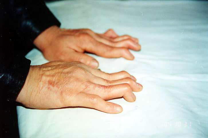 黑龙江省双城市大法弟子付丽,女,41岁,2000年被哈尔滨市万家劳教所折磨得双手残疾,全身疮疤。