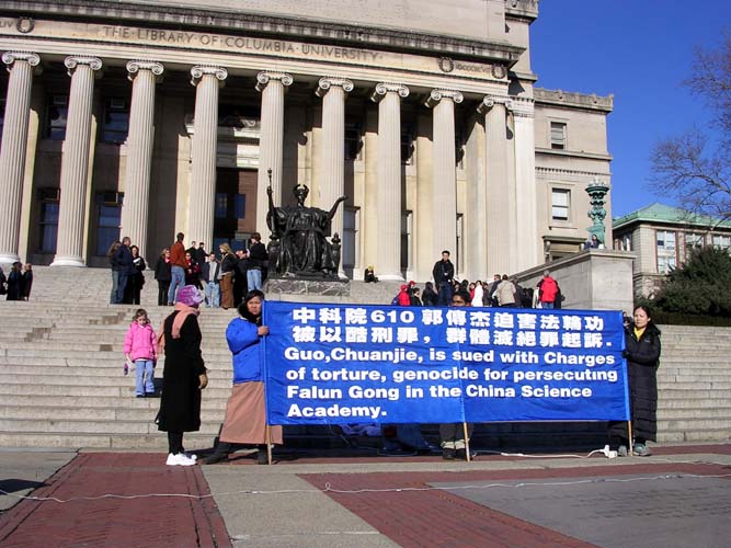 大大的中英文对照的白底蓝字的横幅“中科院610郭传杰迫害法轮功被以酷刑罪、群体灭绝罪起诉”在哥大校园里高高的台阶上非常醒目,背后代表公正的人物铜像更衬出了新闻发布会的庄严。