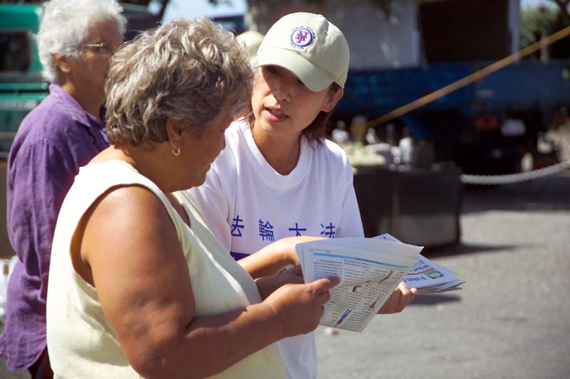 有一位大妈站在摊位前看学员炼功,看完后马上给老伴和孙子打电话要他们立即到这里来学功。学员当场教他们五套功法,当学完三套动功,老大妈激动的说:“法轮大法太好了,我现在全身舒服极了,难怪中共镇压不下去!”