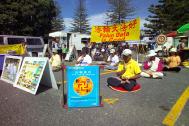 当地的法轮功学员在古典车展的主路海滨一侧的小公园申请了活动地点。他们打出了“法轮大法好”、“坚持正义良知,让我们一起结束对法轮功的迫害”等横幅,并展出了20多幅揭露酷刑迫害的展板。法轮功学员祥和的炼功场面和在中国所遭受的酷刑图片展形成了强烈的对比。许多人睁大了眼睛,听着学员们向他们讲述的事实:中共江氏集团99年发动了对法轮功的镇压,企图强迫修炼者放弃他们的信仰。如果法轮功学员不放弃对真、善、忍的信仰,它就要把学员抓到洗脑班、拘留所强制洗脑、酷刑折磨、强制劳教、非法判刑以至折磨致死。
