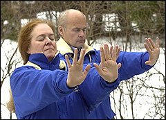 ![]() 玛丽站在她的作品前 | ![]() 盖尔和玛丽在炼法轮功 |