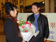 ![]() 法轮功学员也到场欢迎 | ![]() 母子相见,分外开心 | ![]() 母子共同接受媒体采访 |