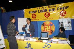 游客喜气洋洋,在各个展位之间来回穿梭。在闹闹攘攘的气氛中,游客来到法轮功展位前,这里却有一片宁静,英文、中文和越文“真、善、忍”横幅吸引了游客的注意,让人耳目一新,展位有介绍法轮功的图文并茂的展板、提供越语、中文、英文的各种资料、VCD.游客不愿错过良机、不断的有游客询问、索取真象资料、观看法轮功学员炼功、有的打听在哪里可以学功。