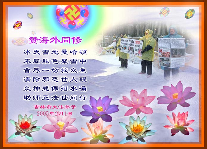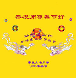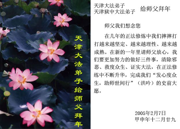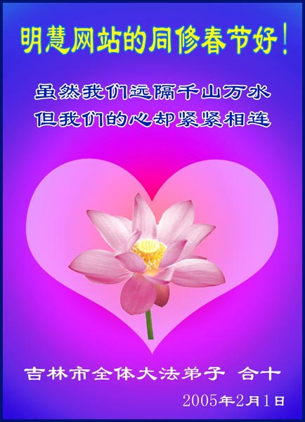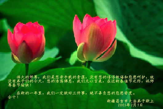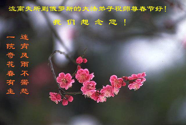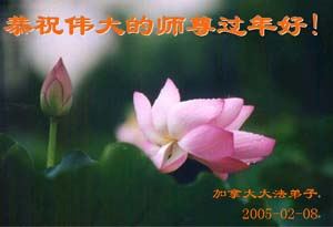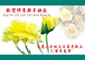 每逢佳节倍思亲。在新春佳节来临之际,让我们双手合十,给慈悲伟大的师尊拜年:您辛苦了!弟子们好想念您!同时我代表那些没有条件上网、而又非常想在新年时向师尊问好的大法弟子,祝师尊新年好!请师尊放心,我们在这正法的最后时刻一定会“坚修大法紧随师”,走好证实法的每一步。