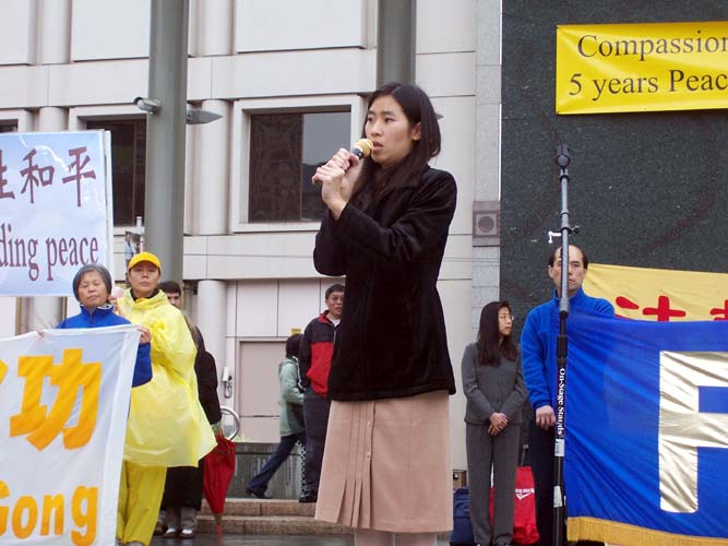 加州国会议员汤姆-兰托斯特地为集会发来信函支持,并派代表玛格丽-法莱女士宣读。兰托斯在致词说,我今天非常高兴和你们一起教育旧金山湾区的社区民众,法轮功学员在面对中共政权五年的迫害中所表现出的和平理性。我赞赏法轮功学员和支持者们长期秉持的和平与慈悲。