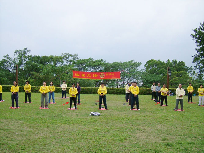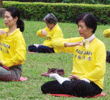 ![]() 颜副局长及颜太太参加洪法炼功(箭头处) | ![]() 右一为颜太太 |