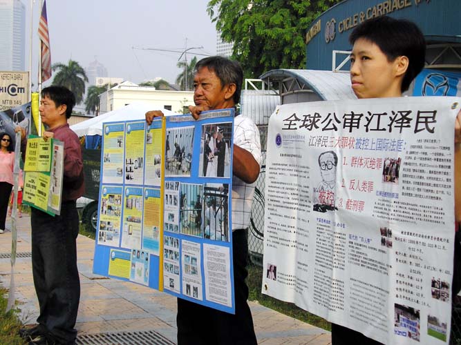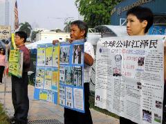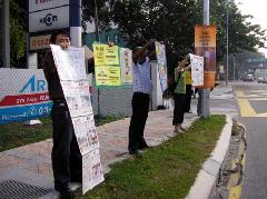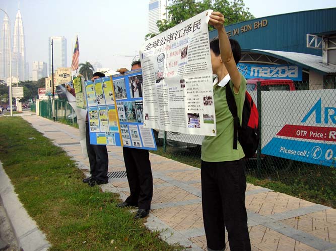 【明慧网2005年3月15日】2005年3月11日和12日,马来西亚法轮功学员一连两天在中国驻马大使馆前和平请愿,呼吁停止在中国对法轮功学员的残酷迫害。学员于上班巅峰时间站在车水马龙的大马路旁发正念,并且拉开“法轮大法好”、“停止迫害法轮功”等横幅,展示受迫害法轮功学员的图片。路过的车辆经过时都放慢速度观看、阅读横幅上的文字。在场的警员也纷纷向学员索取真象资料,了解迫害事实。