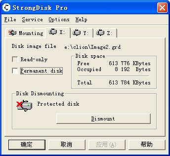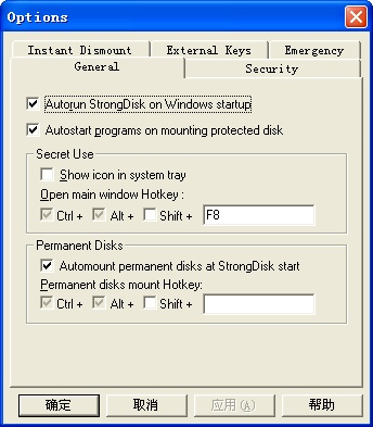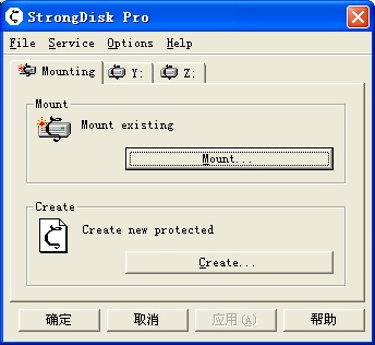 安装StrongDisk后重启。设置热键,主菜单中options—general之open window Hotkey打开主窗口,instant dismount中的热键关闭所有已打开的加密文件。用Mount打开加密文件,用create创建加密文件。加密文件的格式是一个虚拟的磁盘,一般选用FAT32格式,floating size比较好,能自动按内容大小增长文件大小,空间可选大些(600MB),最大4G。加密算法用默认选项就好。关闭文件前需要先关闭资源管理器。密码可用一个字串,也可用一整个文件。