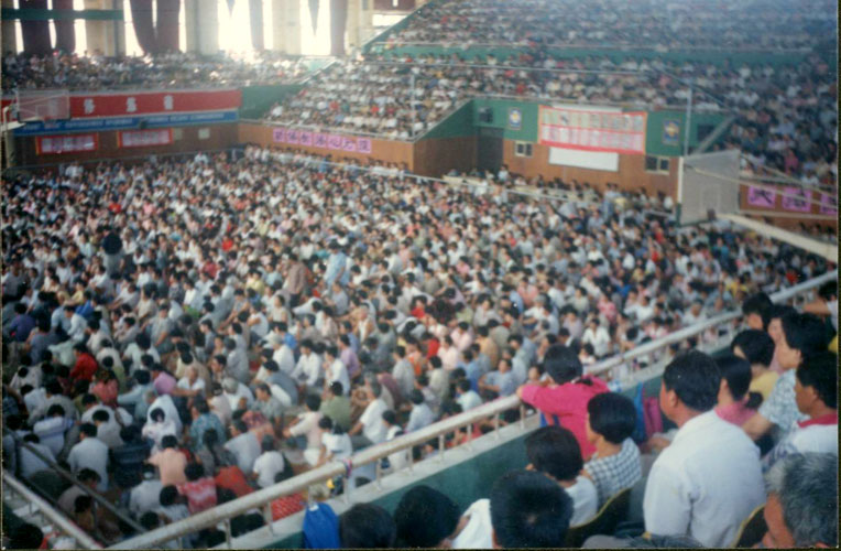 图片说明:一九九八年八月份,在山东省莱西市体育馆内,成功召开了四千五百多人的法轮大法学法心得交流会。参加交流会的有:青岛、潍坊、即墨、平度、莱阳、栖霞、海阳等地的法轮功学员,整个体育馆内座无虚席,地上全挤满了人,实在没办法最后有站在门口听的。整个会场充满着祥和、慈悲的场。