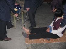 【明慧网2005年3月15日】以下记录了河北省高阳劳教所于2002年对大法弟子的部分折磨手段。照片为根据当事人描述而重组的当时迫害的情景。