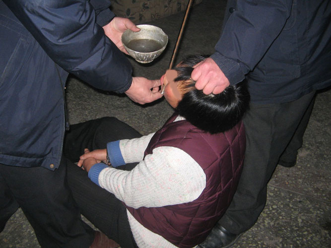 演示图2 三、因大法弟子绝食抵制迫害,遭灭绝人性的灌粪便迫害折磨。两个队长和一个犯人拿着铁棍子敲开牙齿。