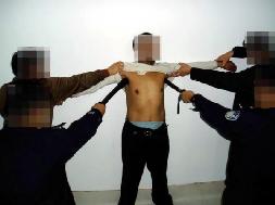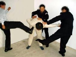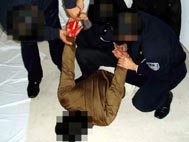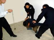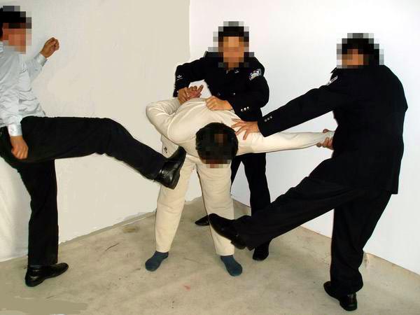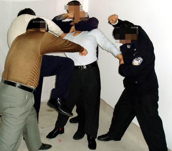 对坚定不屈服的学员,邪恶的管教指使犯人一拥而上(少则三、四人,多则八、九人)对学员进行疯狂毒打,或用拳击、或用脚猛踹、或用膝盖猛力撞击,把学员打得鼻青脸肿、面目皆非,有的学员内脏都被打坏了,开始咳血。过后多日身体仍疼痛难忍,身心受到严重摧残(几乎所有学员都受过此酷刑折磨)。图5、6、7都是此酷刑演示