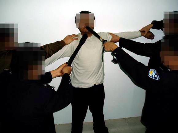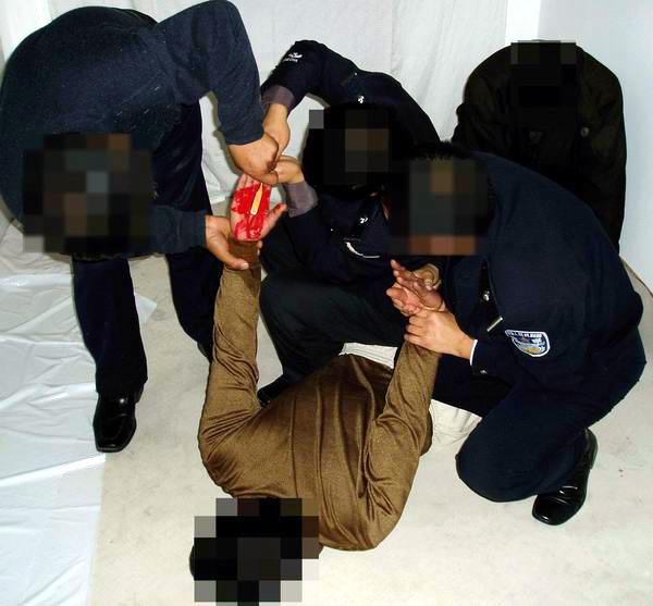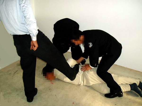 四、五个犯人把学员按趴在地上,胸腹着地,把两臂反剪在背后,两个犯人拽着胳膊,两个犯人拽着腿,用力向外侧拧脚踝,拽住胳膊的犯人用力从背后成反关节推压,把两臂从背后推压至90~180度角,有时甚至把学员两臂从背后成180度角来回划动,反复推压,这时手从臀部划过背后,再划过头顶,最后将学员的手从背后成180度角按在地上,肩部是反关节,学员的肌肉和韧带被撕裂了,剧痛无比,疼得死去活来,有时昏死过去,由于学员头部和脖子承受巨大压力,被紧紧压在地上,几乎不能呼吸(断气了),脸与地面来回摩擦,疼痛难忍,此酷刑的痛苦和残忍程度是难以想象的,很多法轮功学员都受到此酷刑的折磨。(受此酷刑的学员有孙开清、云福起、黄铁诚、孙同庆、杨雪秋、闫继国等,以上仅为部分学员,很多受此酷刑的学员姓名不详。)(如图1)