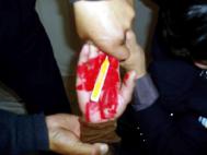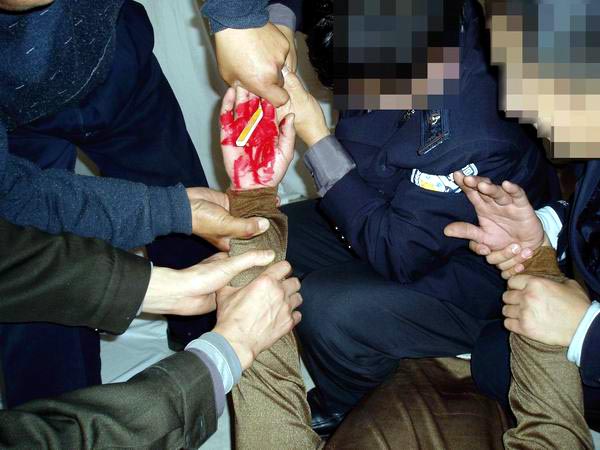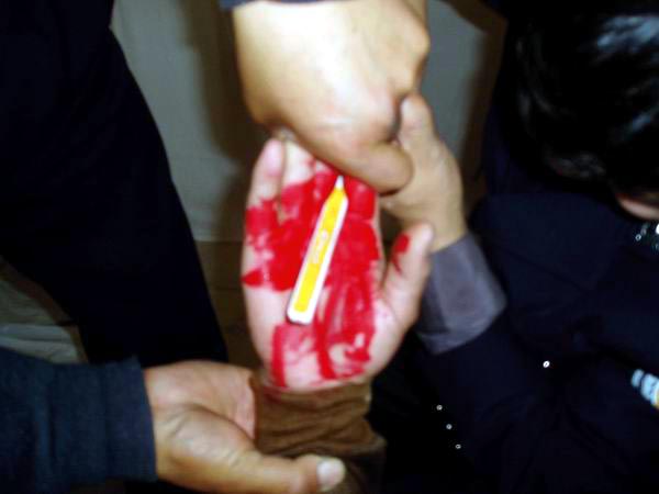 6、7名犯人将学员按趴在地上,有的犯人按腿,有的骑在身上,两名犯人扳住胳膊,把学员手臂背到背后,把手指间插入硬物(四方的牙刷把或扁方的铁棍),用力握紧指端,一名犯人用力转动硬物在手指间搅动,把学员的两手搅的血肉模糊,钻心的剧痛,手指上的肉都搅掉了,露出白骨。有的学员多根手指被掰骨折。有的学员双手被搅的血肉模糊,在伤口未愈合的情况下又被连续多次的上刑,一连几天都多次受此酷刑折磨。次数越多就越痛苦,十指连心,钻心的剧痛 (受此酷刑的学员有:云福起、孙同庆、黄铁诚等等) 。图2、3、4都是此酷刑演示。