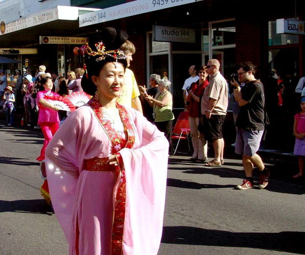 ![]() 喜气洋洋的腰鼓队 | ![]() 法轮功队伍中的仙女 |