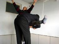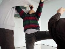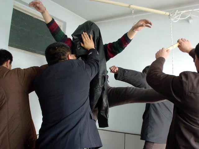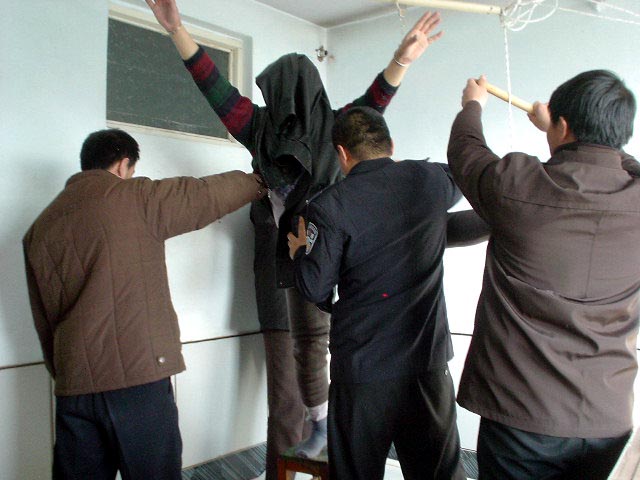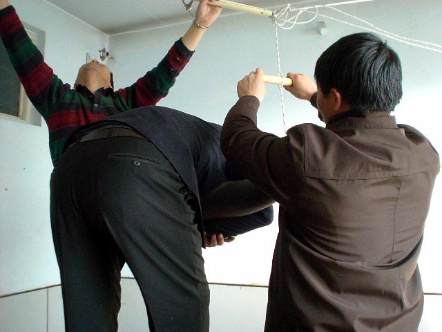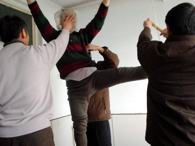 進到派出所,恶警杜玉琢就恶狠狠的说:你还讲不讲法了!让你喊!不由分说就让恶警李卓用手铐和脚镣将我双手铐起来上了大挂,将我的右脚用脚镣扣在暖气管道回水管上,我只能脚尖沾地。杜玉琢又让给派出所开轿车的年轻司机(警察)用细尼龙绳(筷子那样粗细)拴在我的左脚踝骨上吊在棚上的铁环上,而且还用木棒插到绳子中间使劲绞,把左脚高高吊起来,整个人被上下左右拉起来,只能右脚尖沾地。恶警所长杨树华先是坐在桌子上用双腿压在我的左大腿根部,使劲用力晃动,他觉得还不够劲,就站在地上把整个上身压在我的腿上使劲往下压使劲晃。杨树华长得又肥又胖,他还得意问我,怎么样?得劲不?王鑫长、杜玉琢、李卓等在旁边嘲笑我。见我不吱声,就用我的皮夹克(我儿子刚送来的),用袖筒套在我的头上,他们几个就乱打我,有的在两边用手使劲抠我的两肋,有的用拳往头上打,用脚往身上乱踢。恶警李卓邪恶至极,他用手隔着皮夹克堵住我的口和鼻,不让我呼吸,企图窒息我,边掐边问:你说不说?追问真象资料来源,当时虽然巨痛难忍,但我想有师在,有法在,有师父加持,你们不配问我!我在心里不断的背诵师父《无存》、《助师》、《威德》、《见真性》等经文。任他们任何酷刑我也不吱声。(以下照片为根据当事人描述,由法轮功学员重组的当时迫害的情景。)