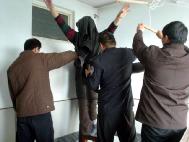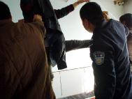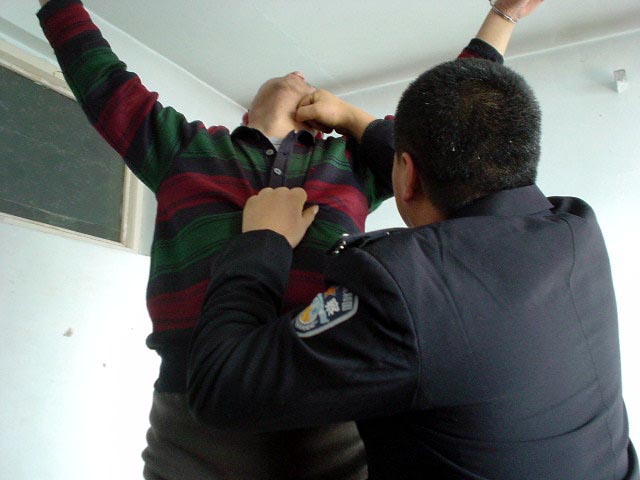 恶警李卓阻止家属和同修给我们送饭,还威胁说:再不走连你们也抓起来!李卓不让我方便,又不让我喝水,在我强烈要求下,15日晚只让我方便一次,回来就吊上,到了零点以后,因我被吊铐在铁环上,有摩擦声,恶警李卓不让我出声,说有响声他睡不着觉,我说:你这么吊着我能没有响声吗?他只好将我放下,让我躺在水泥地上,呈大字型手脚都被绑住不能动。16日早刚5点钟又将我吊起来,直到8点才放一次便,整个一白天,不让喝水進食,不许方便,后来被吊得小便失禁,都便在裤子上了,顺着脚往下淌,直到晚上18点,要将我和妻子送看守所这才把我放下来,当时我的左腿膝盖以下完全失去知觉,不能动也站不起来,双手腕被手铐勒得鲜血淋淋。给我们送到看守所时,是我妻子搀着進的监室。