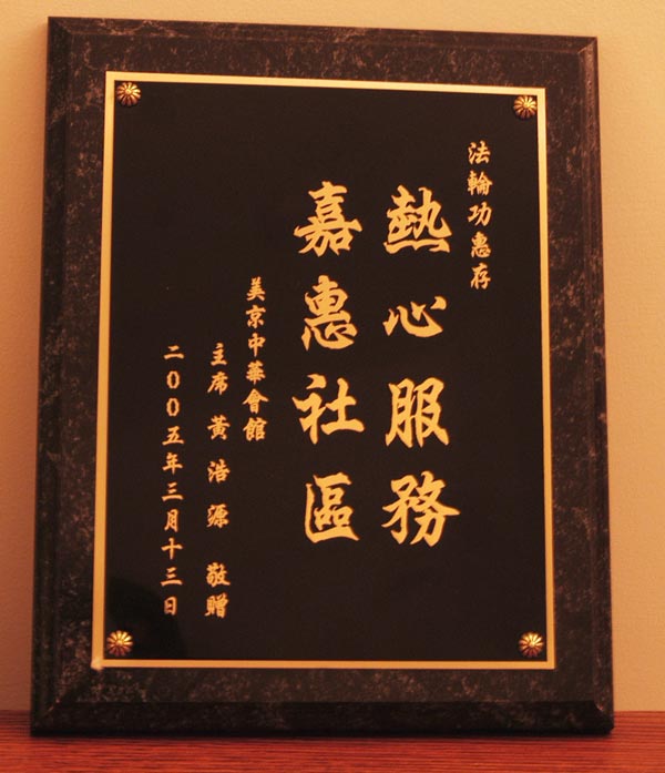 中华会馆主席黄浩源在向法轮功学员颁奖时说:“感谢多年来法轮功学员默默无私的为华人社区做义工,热心公益,服务社区,我们非常感谢,特赠此奖牌以示表彰。”