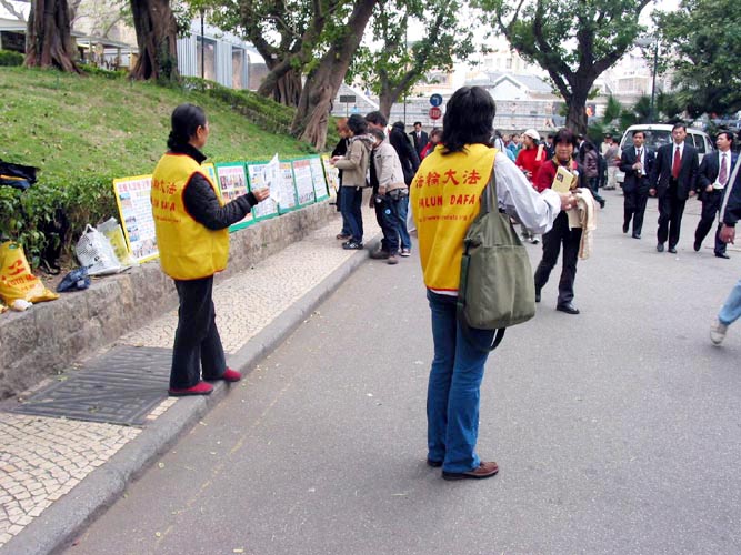 目前,澳门法轮功学员们以手举真象资料的形式继续在旅游景点讲真象,同时,还将进一步和警方联系,讲清真象,也真诚希望澳门警方能抵制来自中共的压力,以善心、良知公正的对待法轮功及法轮功学员。