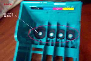 在注射器中吸入清洁的纯净水或蒸馏水,冲洗墨盒的出墨口(图1)和喷头的进墨口(图2),必要时用棉球蘸上酒精,轻轻的擦拭喷头的进墨口(图2),不可用力太大。不要用面纸、镜片纸、布等擦拭喷嘴进墨口表面。