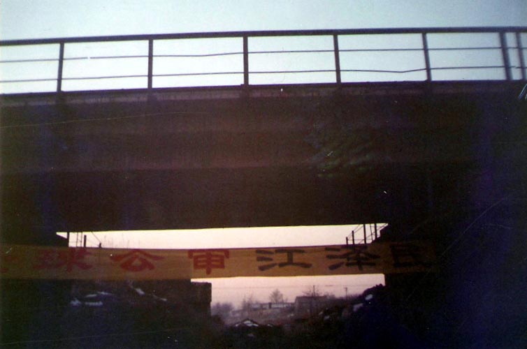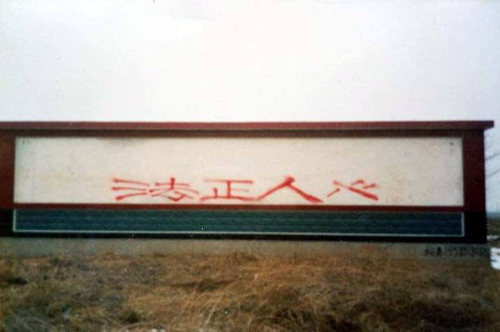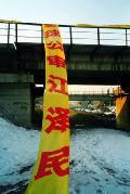 【明慧网2005年3月31日】图为山东潍坊大法弟子挂出的真象标语和条幅。