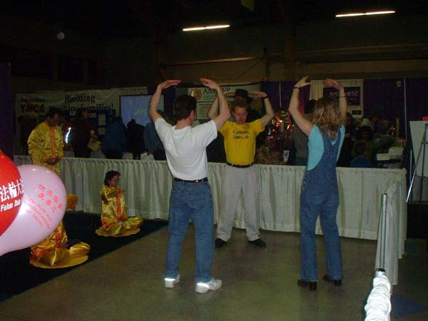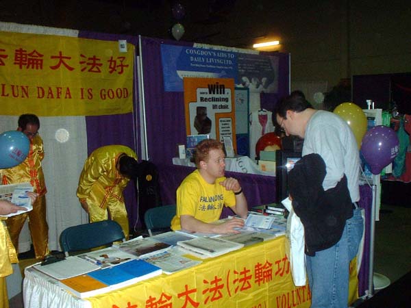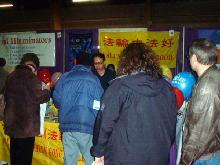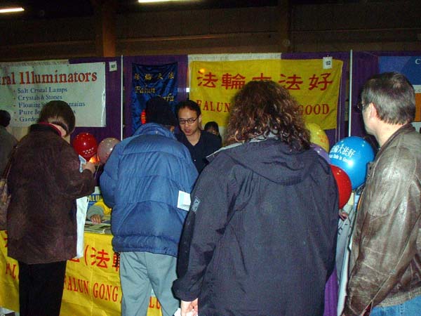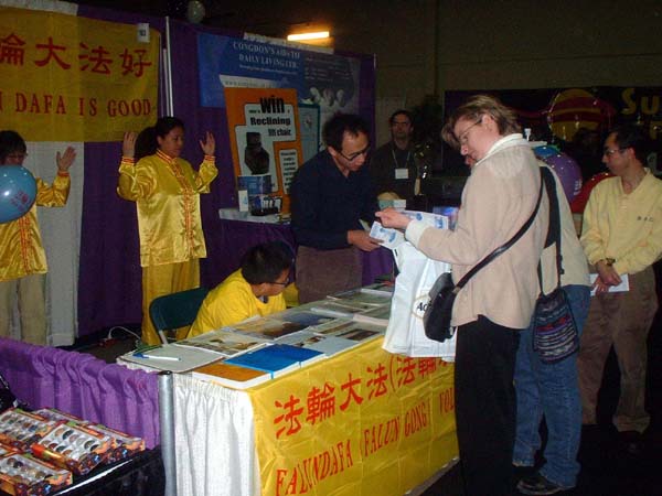 有趣的是很多其它参展团体的人员纷纷到法轮功学员这里了解情况和索取材料,有几个参展团体的组织者邀请学员去他们的社团教功,并要了很多洪法传单说要放在他们自己的展位上让人们拿。