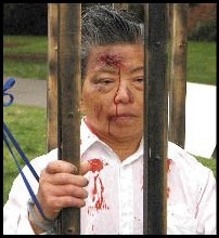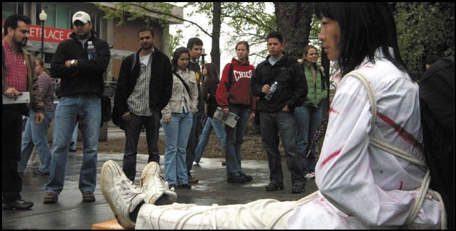3月23日,在自由论坛区,一张张血迹斑斑,注视着前方的面孔引起了州立大学契柯分校学生们的关注。据法轮功学员科特说,在纽约这样的更大一些的城市里,类似自由论坛区这样的酷刑演示很常见。