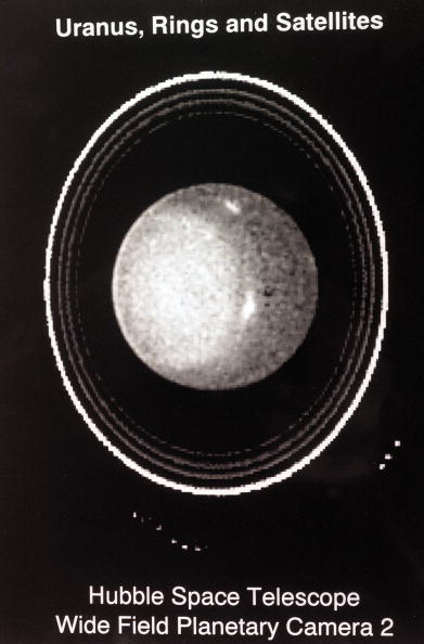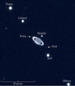 ![]() 欧洲天文学家利用架设在智利的ANTU望远镜拍摄到一幅天王星(中心的大星)独特照片,照片是用近红外波段(波长为2.2微米)拍摄的,在照片上可以清楚地看到天王星的光环及其7颗卫星。 |