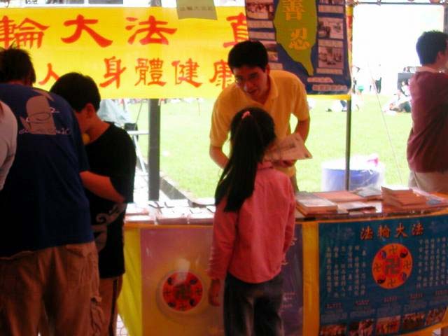 一位住在学校附近的老伯伯经过展位时前来询问,由于他经常收看大陆中央电视台的节目,听信了天安门自焚伪案等谎言。学员耐心的说明法轮功已洪传世界60多国,使全球一亿多人身心健康,迄今已获得到各国一千三百多项褒奖;而在与台湾一水之隔的大陆,却因为学炼人数太多,坚持“真、善、忍”信仰的法轮功学员近六年来遭受江氏集团诬蔑造谣与镇压迫害。
