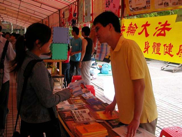 今年交大的校庆,安排了园游会、高中学生参访、邀请毕业校友回校及企业征才等活动,吸引了许多校外民众参观。在社团展位的走道上,游客络绎不绝,对法轮功有兴趣了解的人,便停下来索取资料,其中有高中生,小女孩,还有一家大小出游的民众,有其它社团的学生也来了解,并且索取了一本法轮功最重要的著作《转法轮》回去阅读。校长经过时,也曾驻足观看,大声念着横幅上的“法轮大法”四个字。学校里负责管理社团的课外活动组职员也前来参观,她原本就相当支持法轮 功,此次又拿了一些简介和光盘,也想借阅一本法轮功学员的著作《医山夜话》,展现彼此良好的互动。