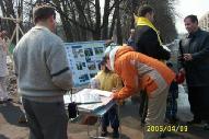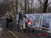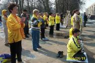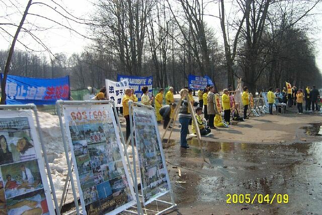学员们并在中使馆前集体发正念,向路人、施工工人和使馆前值班的警察讲真象,发放真象资料。人们都非常关心和谴责中国对法轮功学员残酷的迫害。有的人在了解了真象之后主动的索取资料,并签名要求制止迫害。有两位骑自行车路过这里的年轻人,当他们了解真象之后,主动放下自行车站在学员队伍中说:“我们和你们一起進行抗议”。