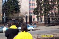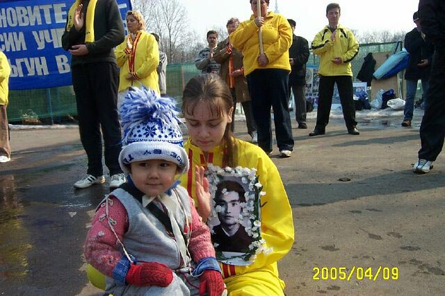 ![]() 小弟子索尼亚和弟弟萨沙要求停止迫害法轮功 | ![]() 学员代表用扩音器在中使馆前发表了集会抗议声明 |