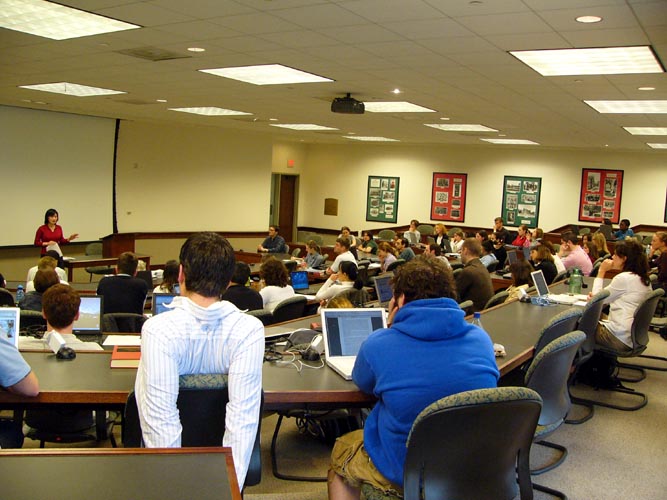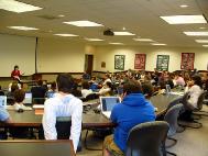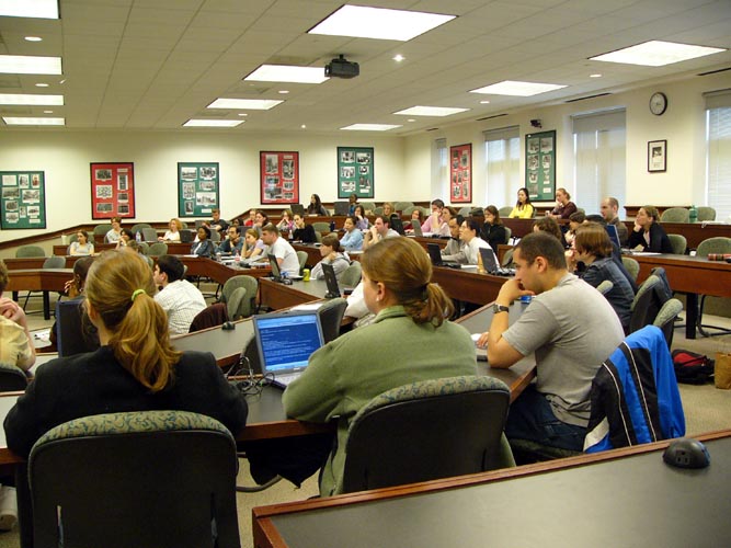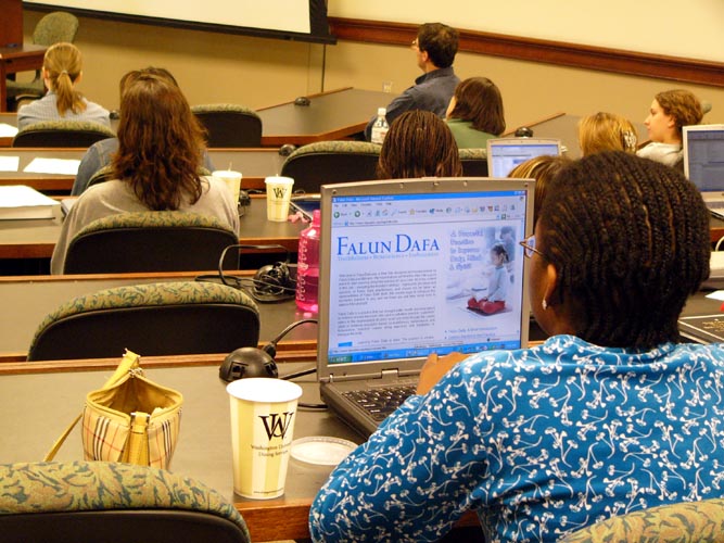 一小时二十分钟的课,学员介绍了什么是法轮功,在中国发生的残酷迫害,播放了法轮功真象录像,曾被关押在劳教所的学员讲述了自己的亲身经历。随后的回答问题部分,学生们踊跃提问,时间显然不够用。很多学生当场就用手提电脑上到法轮功的网站上浏览。