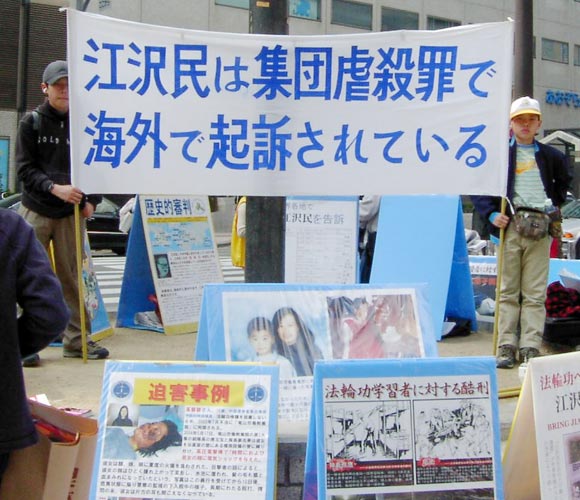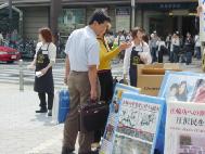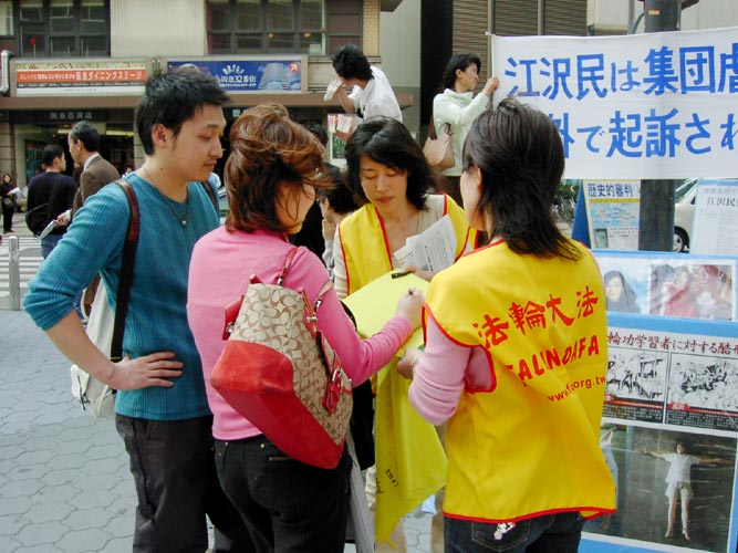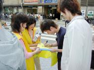 在听到有关呼吁支持诉江及停止迫害法轮功的有声解说以及看到展示大陆法轮功学员遭受酷刑的展板后,有不少人伫足观看。有的主动上来索要传单。有的主动上来在一块支持审江签名的黄布上签上了自己的名字。有不少路人表示,早已了解了发生在中国的这场迫害。他们表示对中共非常反感。更有一位老太太主动上前要了一厚叠传单,表示要将其带给自己的亲朋好友。还有不少人表示,过去受到中共江氏集团散布到的海外的谎言误导,对法轮功有一些非正面的看法,今天看了真象资料及听了学员的解说之后,才恍然大悟,同时他们也对学员把真象告诉了他们表示感谢。