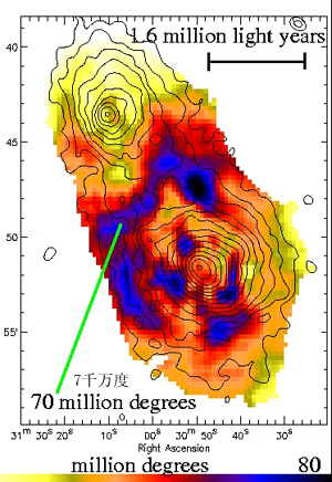 ![]() 多重星系群A1750的X射线轮廓图。两星系群碰撞的速度达每秒1400公里,在两星系群间的气体被冲击和压缩,产生出一弧状气体带。 |
