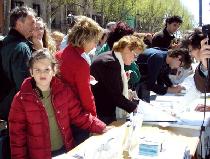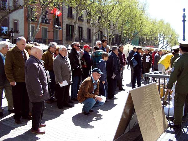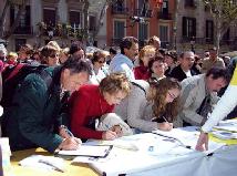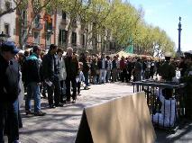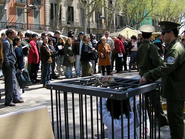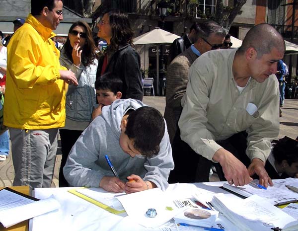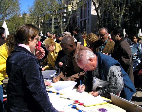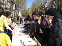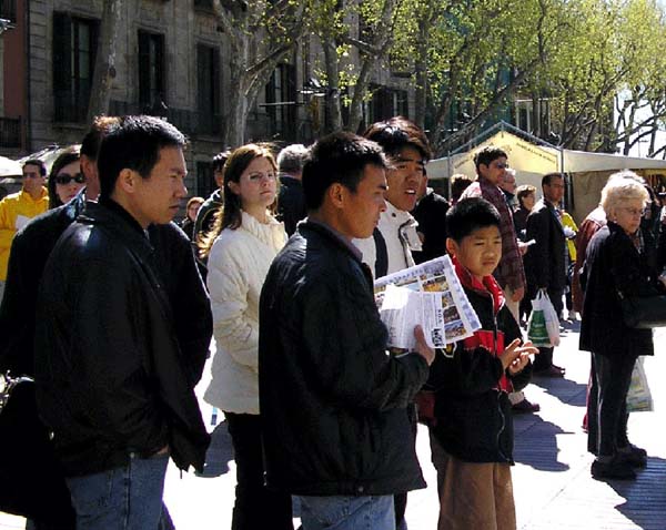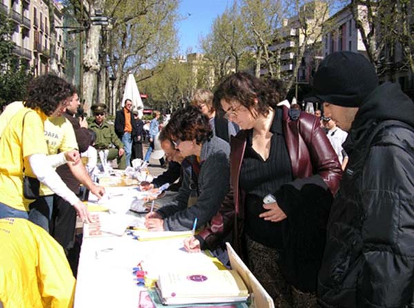 2005年4月10日,西班牙法轮功学员在巴塞罗那(Barcelona)市中心最繁华的兰布朗大道举办了反酷刑展以揭露江氏集团在中国对法轮功的残酷迫害。上午10点,学员们到达兰布朗大道,刚摆放好部分图片,其它一切都还没有布置好时,就不断有人过来观看图片,询问发生了什么事。当知道了在中国正在发生的对法轮功的迫害后,人们纷纷签名表示声援法轮功学员,呼吁停止迫害。