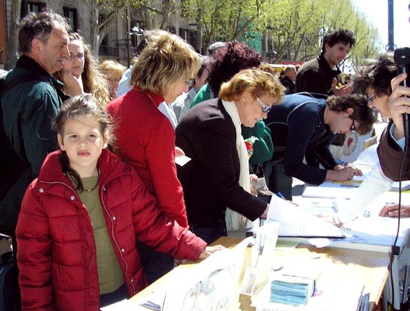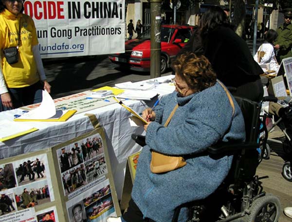 一位老年女士看到真人酷刑演示,开始时还以为是在西班牙国土上发生这样的事,不由叫出了声:“这里是西班牙,怎么能允许这样的事发生?!”当她得知是在演示中国发生的迫害时,马上站到队伍中等候签名支持法轮功学员。