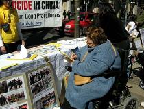 一位坐轮椅的老妇人经过这里,在仔仔细细看了酷刑图板上的说明后,由亲人推着轮椅慢慢来到桌子前,旁边的人们自动让开了路,老妇人在呼吁书上郑重的签上自己的名字。