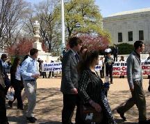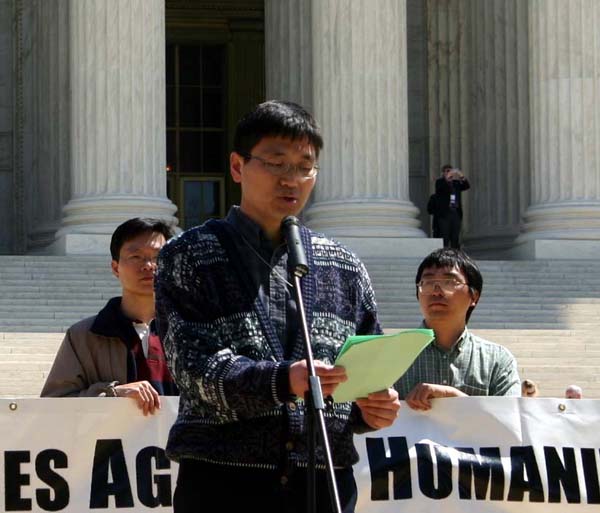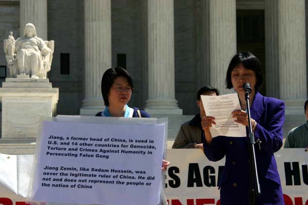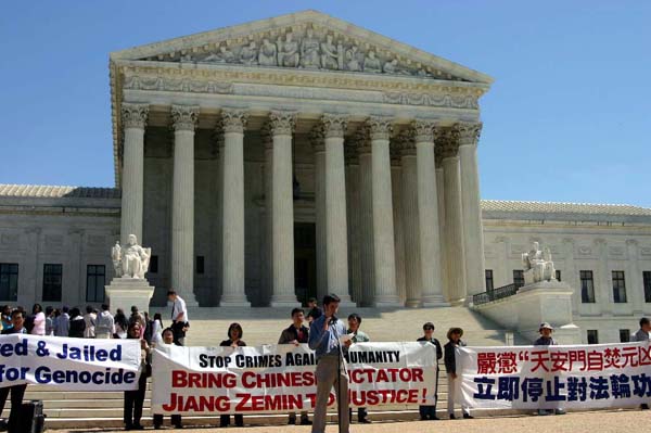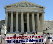 法轮功学员在最高法院前打出写有“停止侵犯人权,法办中国独裁者江泽民”、“杀害及监禁无辜万千 江泽民犯群体灭绝罪被起诉”、“法办江泽民”、“停止在中国(对法轮功)的群体灭绝!”等中英文横幅。