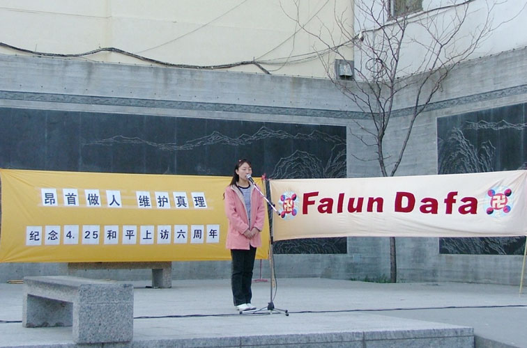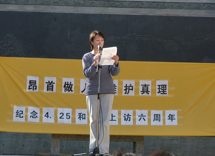 许多法轮功学员走上台,讲述六年来江氏政治流氓集团对法轮功的迫害。老华侨谭先生用广东话讲述4.25的真实过程,许多人都在静静的听。