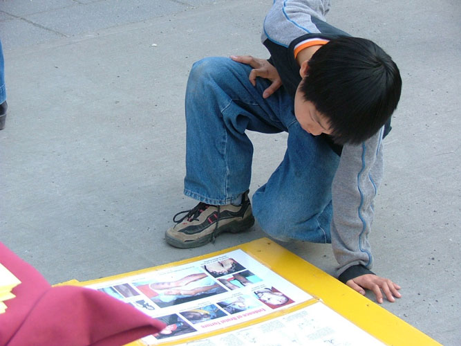 ![]() 认真阅读真象资料 | ![]() 男孩久久凝视揭露迫害的展板 |