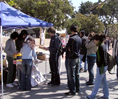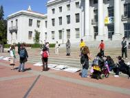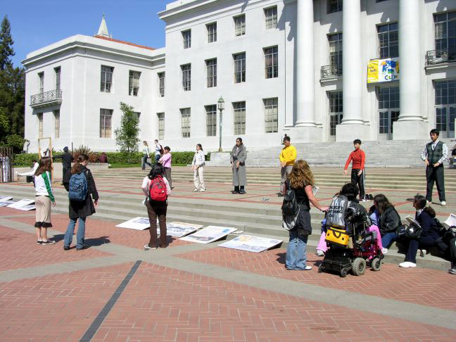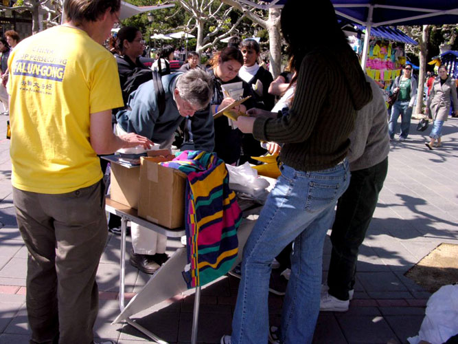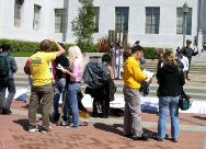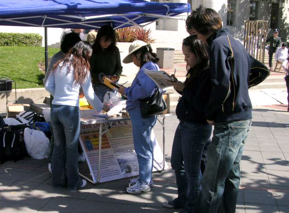 【明慧网2005年4月2日】2005年3月29、30日,北加州湾区的部分法轮功学员,在伯克利大学校园里,举办反酷刑展和真象图片展;吸引该校很多师生驻足观看。该校师生表示惊讶万分,没想到在当今21世纪的文明社会,还有如此残暴的事情发生在中国,还持续了近六年;人们纷纷签名支持反迫害。