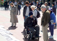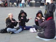 为参加2005年3月27日的复活节大游行,英国各地的很多法轮功学员都提前一天来到爱丁堡。部分学员前往闹市区,一边向游人展示法轮功的五套功法,一边为营救亲人征签。