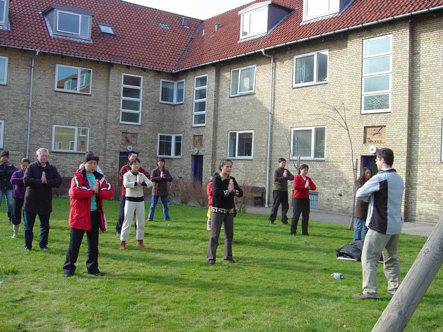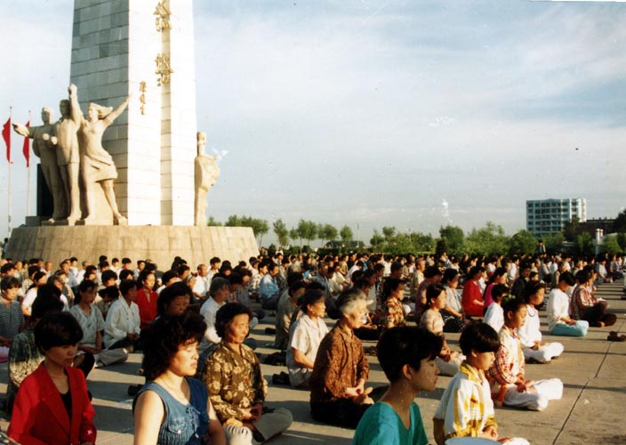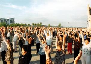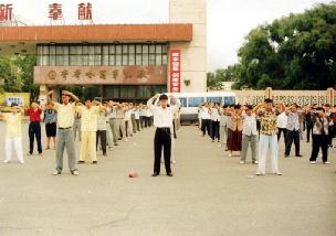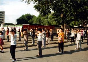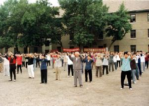![]() 集体炼功 | ![]() 游人观看功法表演 |