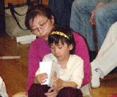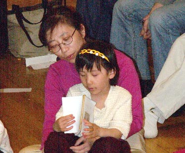 见到久违了的小朋友们,大家很开心。每天我们都用大约半小时,和大人们一起坐成一圈儿唱歌,读《洪吟》 。这是他们最喜欢的活动之一。由小宝宝们自己点歌儿,手舞足蹈的学着各种小动物,唱儿歌。大家最爱唱的歌是“法轮大法好”。小宝宝们都张开小嘴唱,还唱的挺认真。最小的宝宝不到两岁,还不怎么会说话,却会说“法轮大法好”。