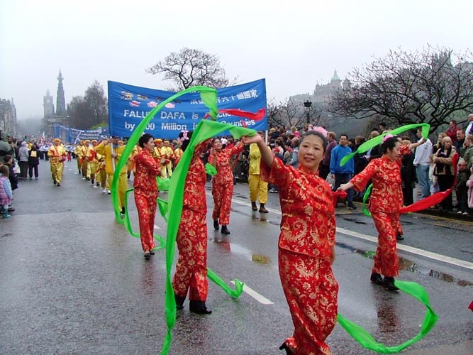 27日这天,下着绵绵细雨,但这并未影响人们的兴致。据爱丁堡最大的地方报纸《爱丁堡晚报(The Edinburgh Evening News)》报导,来自北美、英国的中小学生、非政府团体共四千人参加了大游行,三万五千人观看。该报还在显著位置刊登了题为“法轮功的舞蹈队”的图片报导,因为法轮功是游行队伍中唯一的传播中国传统文化的团队。