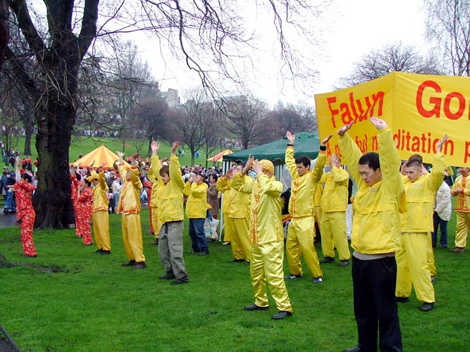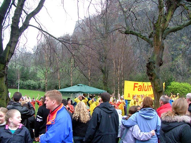 为参加2005年3月27日的复活节大游行,英国各地的很多法轮功学员都提前一天来到爱丁堡。部分学员前往闹市区,一边向游人展示法轮功的五套功法,一边为营救亲人征签。