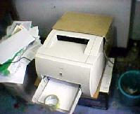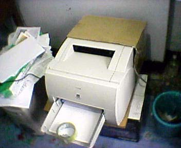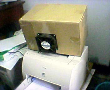 我处是北方某大城市,10公斤散装“希美格”碳粉(一箱分四小包)860元,HP7115与Canon ep25两种鼓完全一样,没灌过粉的二手HP7115鼓90元,耐用程度很高。鼓芯50元,Canon 1210 每台1450元。打印第2面时带纸的原因主要是静电大,解决办法是选用纯木浆纸,我用过亚龙系列的尖兵、旗兵、乐透等多种木浆纸,A型价格均为114(现价),且打完正面后多晾一会,晾后打另一面,如下图在纸上压一个宽胶带。这样几乎不带纸,我处的一老年女同修同时使用两台,打印时无需看机器,可做其他工作。降温办法是背后加抽风电扇,如下图:温度解决后可整天连续打印。风扇选220v 电流 0.18A即可,大概17元。USB打印电缆要买一个带磁环的,可防电磁干扰。个人体会,供同修参考。